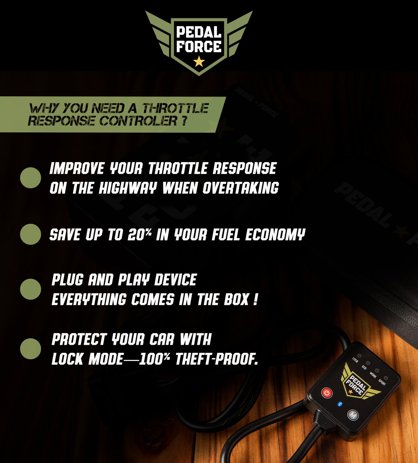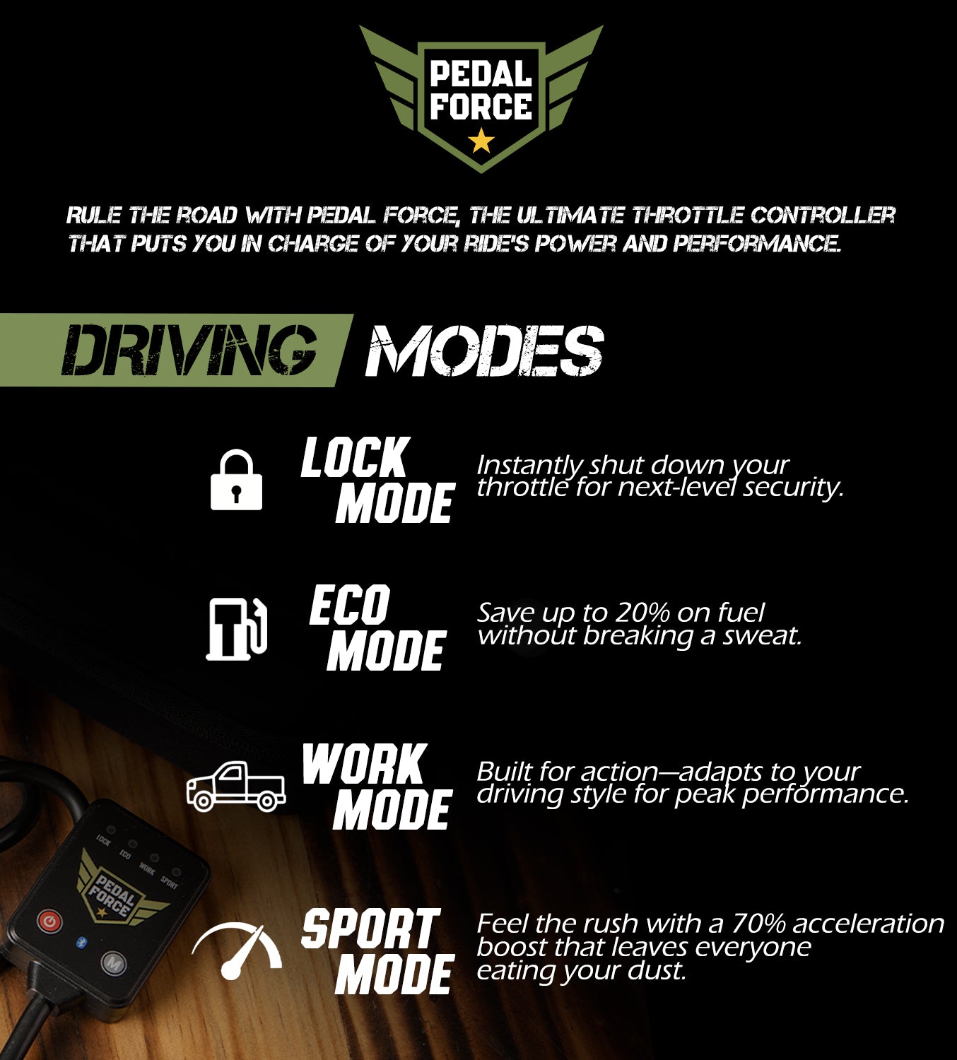Pedal Force is a performance device that connects directly to your vehicle's electronic throttle pedal to eliminate acceleration delay and deliver instant response.